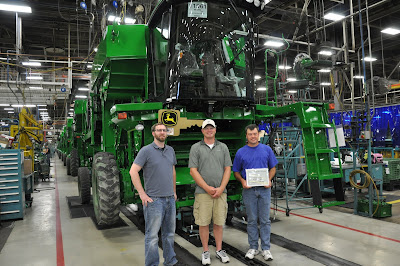 Oh my god, it's the John Deere Harvester Works tour wrap-up. I was lucky to go with Haener and Buck to East Moline, IL last Thursday to go on the "Gold Key Tour." So we started off with roughly a 5.5 hour (from my house) drive to the John Deere World Headquarters. The first area you walk in to is a huge building that has a combine, a couple of tractors, a grater, a gator, and other misc. Deere equipment. Oh, and you come in on the second floor. So you're standing above all this. Very cool. Then we got to strap the feedbag on and take a little tour of the headquarters. The outside of the building is Core-10 steel. And yes, it is supposed to rust. And that seals it, so you don't need to paint. For a building that was built in the 60's, it still has an impressive look. The inside is pretty nice too (they could use new signs though). After that, we strolled around the "showroom" a little (and trying to figure out how they got these machines in to the building) and then took a short drive to the Harvester Works. This is, in lay man's terms, the combine factory. We watched a little video about the factory and then we headed out to the factory. Where we hopped on a trailer with seats while a John Deere lawn mower pulled us around the 80 acre (just one building is 80 acres, zoinks) factory and a little bit outside the factory. It's very impressive. Here's just some of the fun facts: 80 (I may be off on this number but it was somewhere around here) laser cutting machines, 70 robotic laser welding machines, a bunch of press', and a ridiculous overhead chain-driven conveyor system. The paint system alone is crazy. They dip each piece in 7 or 8 different tanks to clean the pieces, degrease them, and paint. And then these pieces go in the robotic painting booth. And then two people hit the pieces with more paint. And all the excess gets funneled into this huge waste paint consolidation tank thing. They only go through 30,000 gallons of paint a year. Damn. Roughly 20 gallons per combine. I could probably go on for hours, but I won't. Basically, if you want to see something awesome being made, check out the Harvester Works. You can just get a regular tour but if I were you, I would just buy a new combine so you can get the "Gold Key" tour. It's so worth it. You get free food, a hat (that says "Gold Key Member"), and an actual gold key to start your combine with.